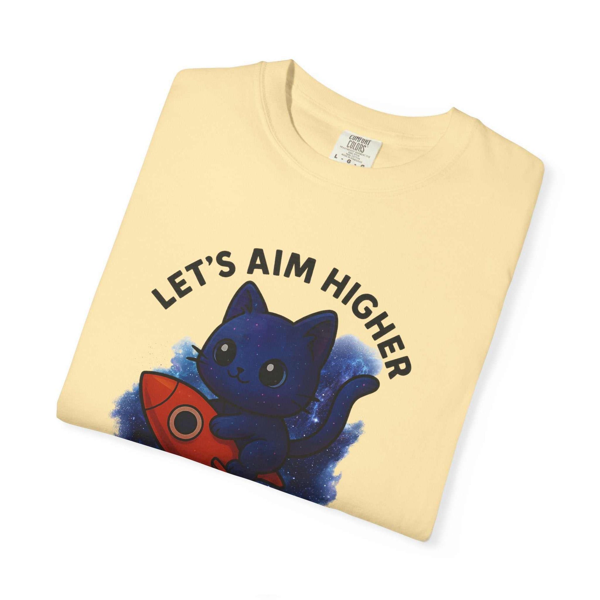 Soft, lived-in comfort with a little bit of wonder. This garment-dyed tee feels broken-in from day one and carries a dreamy illustration of a midnight cat launching a tiny rocket beneath the words “Let’s Aim Higher.” The relaxed cut drapes easily over layered outfits or stands alone on warm days, and the muted, washed color from the garment-dye gives the print a cozy, stitched-in look rather than something loud or stiff. Wear it to late-night stargazing, creative meetups, or when you need a quiet nudge to choose curiosity over mere survival. The sewn-in label and sturdy double-needle stitching mean this shirt will be part of your rotation for seasons to come.