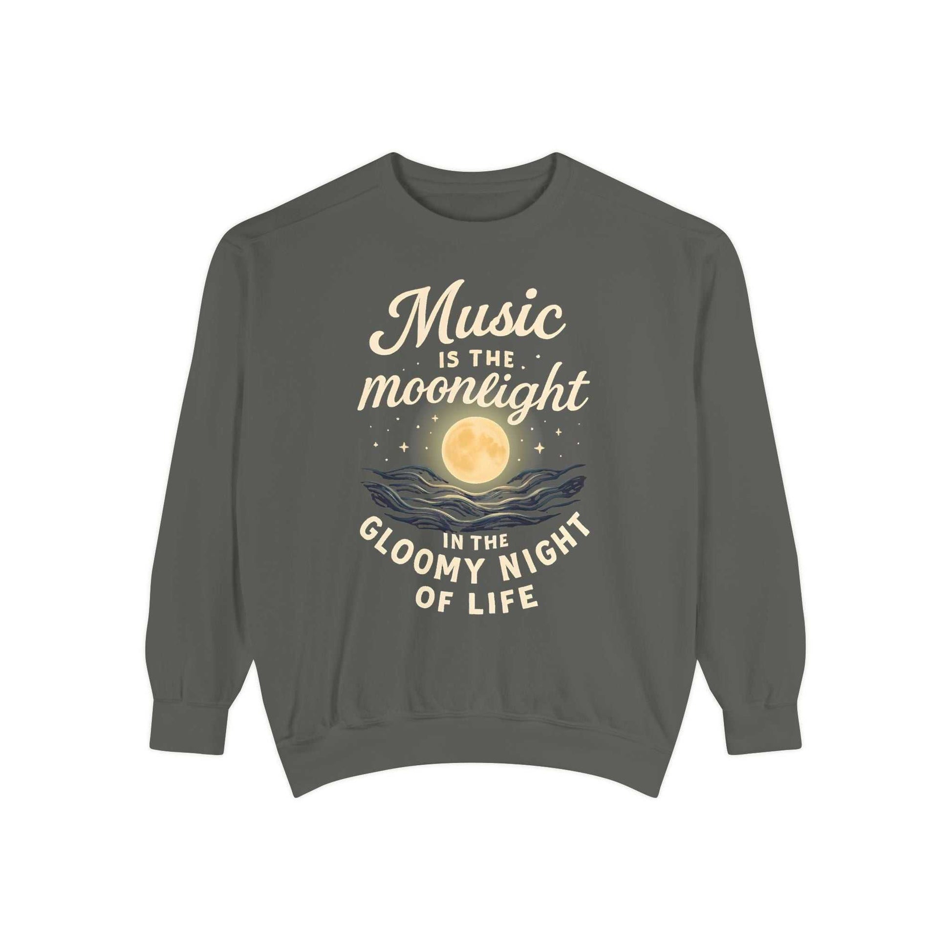 Introducing our cozy Unisex Garment-Dyed Sweatshirt, designed for ultimate comfort and style. This sweatshirt exudes a relaxed vibe, perfect for casual outings or cozy evenings at home. Made from a soft cotton-polyester blend, it feels luxurious against the skin, making it a staple for every wardrobe. Ideal for music lovers, this design features the uplifting phrase 'Music is the moonlight in the gloomy night of life,' which resonates deeply during reflective moments or gatherings with friends. This sweatshirt is perfect for autumn outings, holiday celebrations, or simply lounging around. Whether you're gifting it for a birthday, an appreciation event, or just because, this fashionable piece will certainly charm its wearer.
