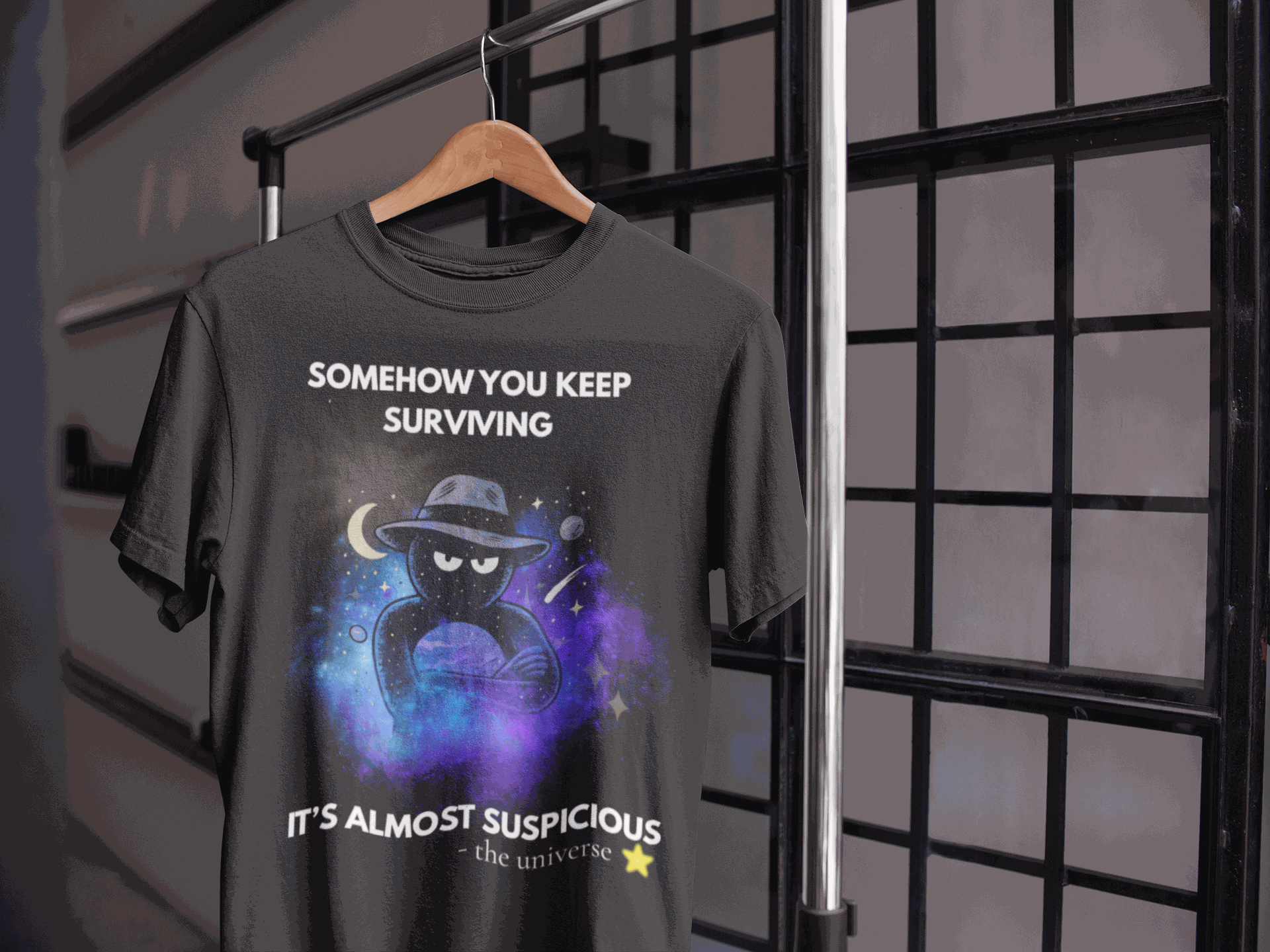 Stay suspicious in style with this cosmic twist on mystery and humor. Featuring a space detective guarding the galaxy with an unimpressed glare, this tee reminds you that survival itself is a little suspicious.